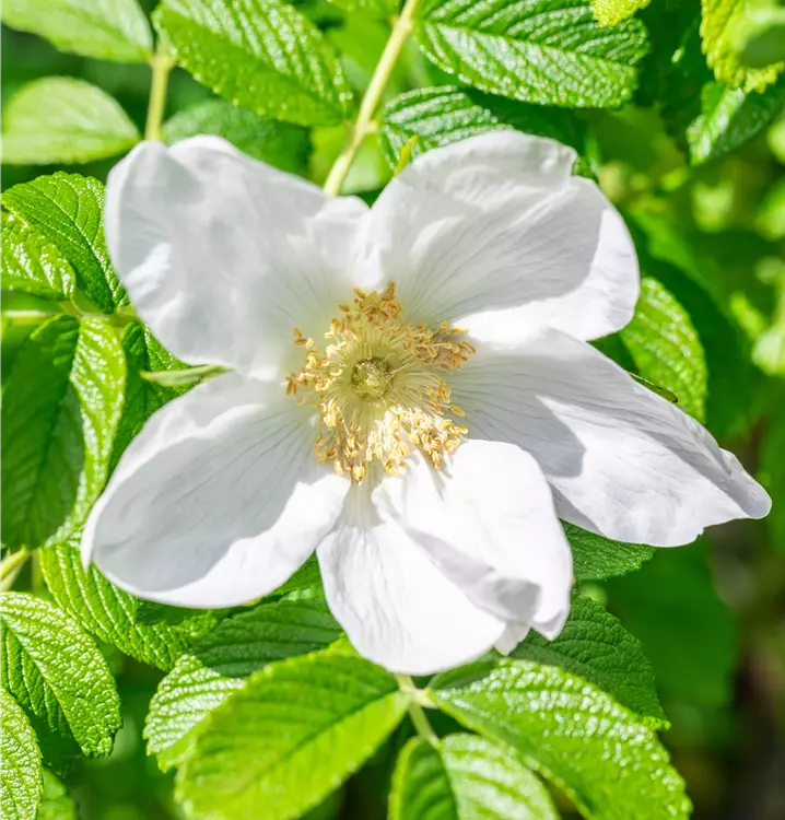 Die Apfel-Rose (Rosa) ist eine reichblühende Rose, die im Garten eine besondere Rolle spielt. Die zahlreichen Blüten sind rosa, weiß oder purpurrot und erscheinen von Juni bis Oktober. Ihr wunderbarer Duft entfaltet sich besonders an sonnigen, warmen Tagen. Zudem haben ihre runden, scharlachroten Früchte einen besonderen Zierwert, wenn sie ab Oktober reif sind. Mit dem aufrechten und straffen Wuchs wird dieser Strauch bis zu 2 m hoch und 1 m breit.