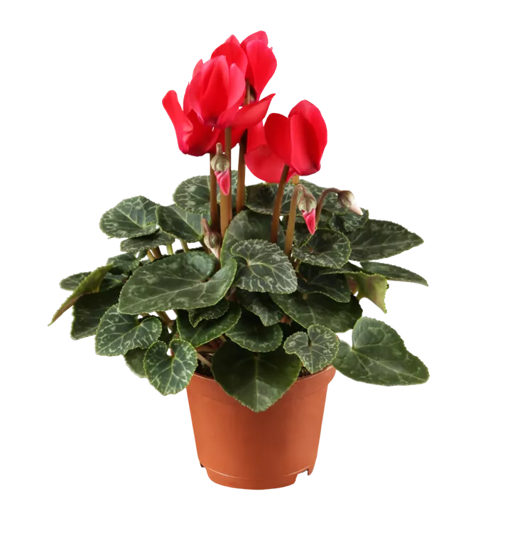 Das Zimmer-Alpenveilchen (Cyclamen persicum) ist eine weiß, pink, rosa, rot, dunkelrot oder lila blühende Pflanze, die herzförmige, mehrfarbige, gezähnte Blätter trägt. Seine Blüten verströmen einen angenehmen Duft und erscheinen von September bis April. Diese aufrechte und dichte Pflanze gedeiht am besten an einem sonnigen bis halbschattigen Standort.