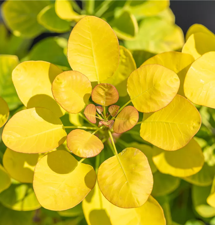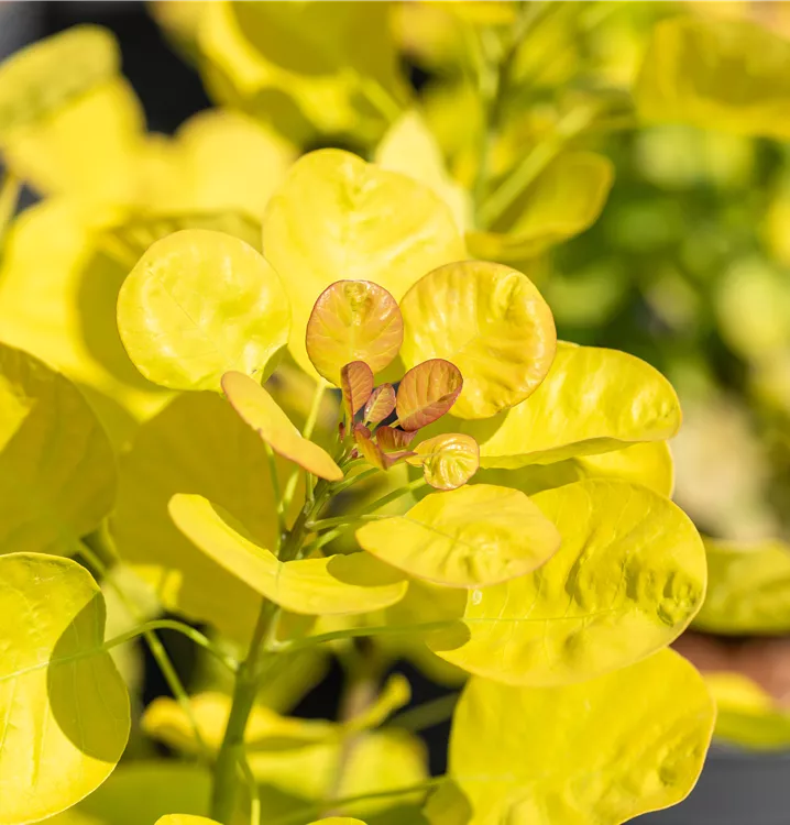 Die sommergrünen Blätter des Perückenstrauchs 'Golden Lady'® sind grüngelb, eiförmig, wechselständig. Diese sind etwa 3 - 8 cm groß. Leuchtend orangegelber Austrieb. Perückenstrauch 'Golden Lady'® zeigt sich leuchtend orange im Herbst.