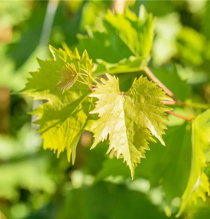 Die sommergrünen Blätter der Tafeltraube 'Muscat Bleu' sind dunkelgrün, herzförmig, gezähnt. Tafeltraube 'Muscat Bleu' zeigt sich leuchtend kupfergelb bis rot im Herbst.