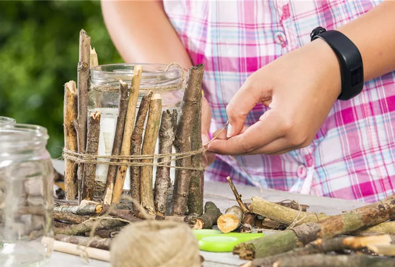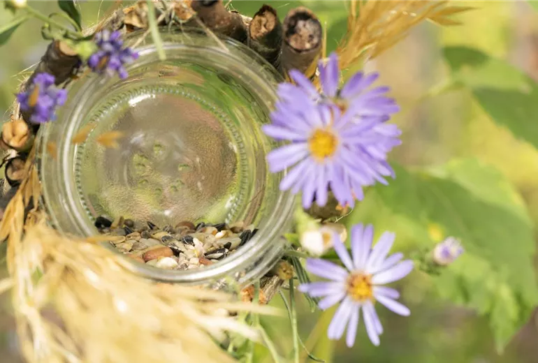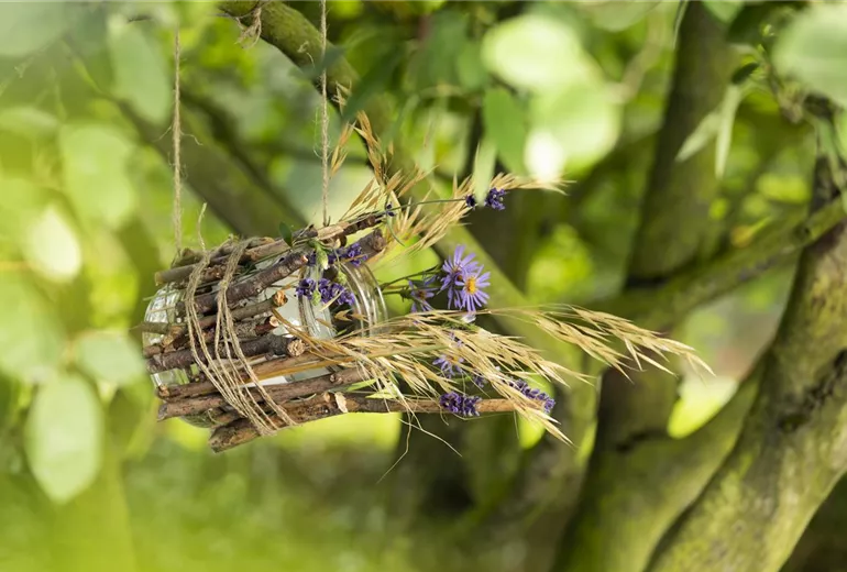 Damit das Vogelhaus nicht einfach nur aus einem Weckglas mit Stöckern besteht, kann es jetzt noch hübsch verziert werden. Besonders gut eignen sich dafür saisonale Wildblumen. Im Sommer verströmt Lavendel einen besonders schönen Duft und sieht dabei auch noch richtig dekorativ aus. Gräser machen sich am Vogelhäuschen auch sehr gut. Je natürlicher die Dekoration am Vogelhaus aussieht, desto wohler fühlen sich die Vögel. Gräser passen sich optimal in das Gartenbild ein und lassen sich durch die dünnen Stiele auch kinderleicht in die Zwischenräume der Stöcker stecken. Damit die Vögel auch gut in das Vogelhaus rein und raus kommen, sollte der Eingang aber nicht von Gräsern und Blüten verdeckt werden. Wenn das Vogelhaus dann fertig dekoriert ist, kann es an den langen Enden vom Paketband im Baum aufgehangen und mit reichlich Vogelfutter befüllt werden.