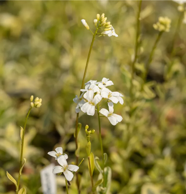 Arabis ferdinandi-coburgii 'Old Gold' bildet radförmige, in Trauben angeordnete, weiße Blüten ab April.