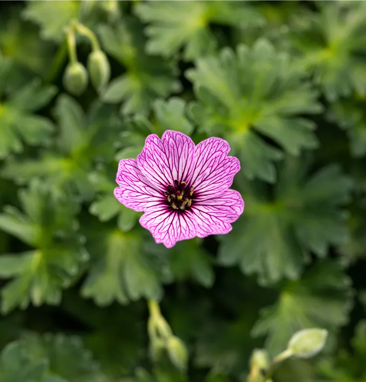 Geranium cinereum 'Ballerina' bildet schalenförmige, lilafarbene Blüten ab Juni.