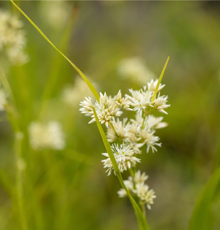 Die weißen Blüten der Schnee-Hainsimse erscheinen in Dolden von Juli bis August.