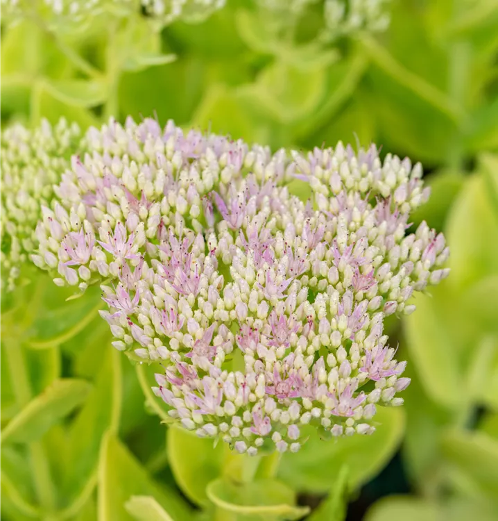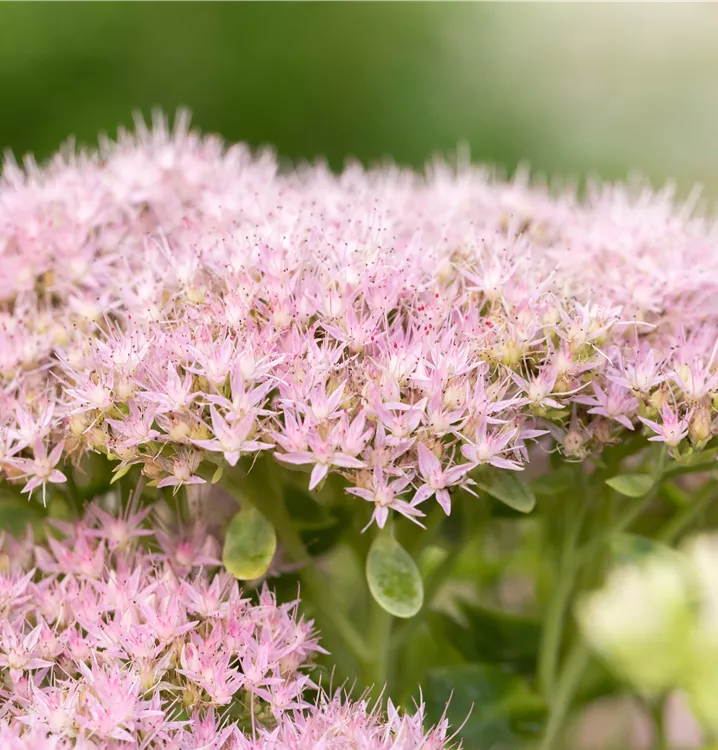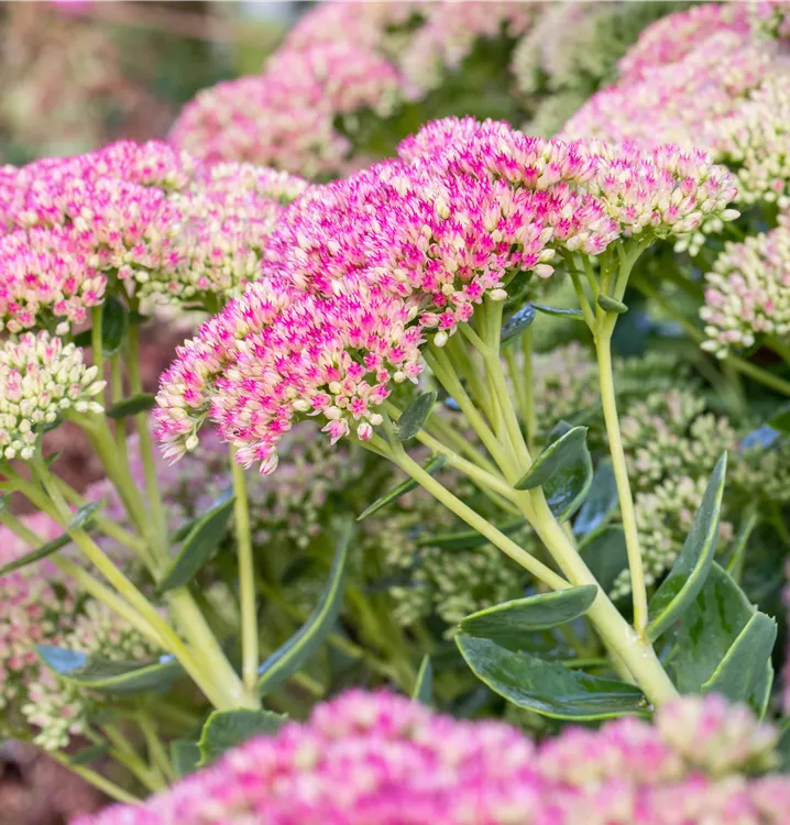 Sedum spectabile 'Brillant' bildet in Dolden angeordnete, rosarote Blüten ab August.